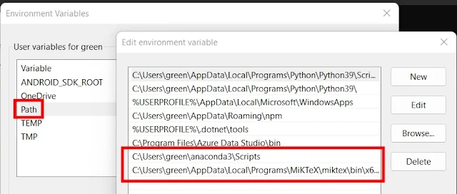- 打開Path,將Python套件的安裝路徑移動至MiKTeX的安裝路徑之前,完成後按保存